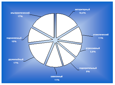 Із цією метою було зроблене опитування групи. Учні повинні були поставити знак «+» проти тих визначень, які відповідали їхньому поданню про себе (якщо немає повного затвердження, знак «+» не ставиться). Методика побудована так, що судження, спрямовані на виявлення якого-небудь типу відносин, розташовані не підряд, а особливим образом, вони групуються по чотирьох і повторюються через рівну кількість визначень. При обробці тесту було підраховано (мал. 1) кількість відносин кожного типу. Як видно з малюнка 1 у групі переважає альтруїстичний (17, %), дружелюбний (17%) і авторитарний (16,4%) типи відносин. У меншій мері виражені егоїстичний, залежний, що підкоряється, підозрілий і агресивний.