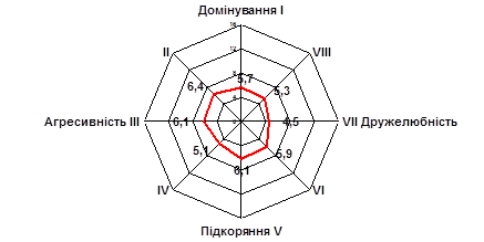 - Октант VII – отримав по групі 4.5 – Дружелюбний тип відносин. Схильний до співробітництва, кооперації, гнучкий і компромісний при рішенні проблем і в конфліктних ситуаціях, прагне бути згідно з думкою навколишніх, свідомо конформний, треба умовностям, правилам і принципам «гарного тону» у відносинах з людьми, ініціативний ентузіаст у досягненні цілей групи, прагне допомагати, почувати себе в центрі уваги, заслужити визнання й любов, товариський, проявляє теплоту й дружелюбність у відносинах.