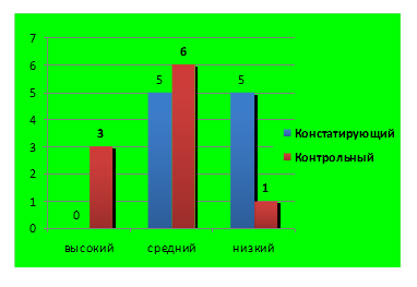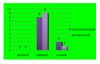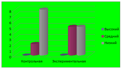 При прочих равных условиях на начальном этапе формирования эксперимента уровень развития детей в контрольной и экспериментальной группах был приблизительно одинаков. Анализ результатов экспериментальной группы до и после формирующего эксперимента свидетельствует об эффективности разработанного нами комплекса методов и приемов. Экспериментальная группа улучшила свои результаты. Процент детей с низким уровнем развития уменьшился на 40%. Соответственно количество детей со средним и высоким уровнем развития также увеличился.