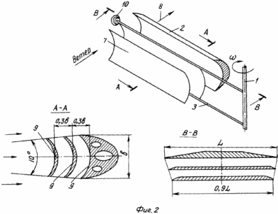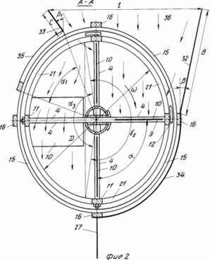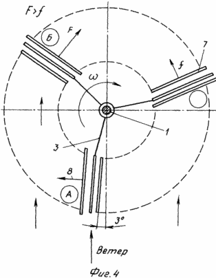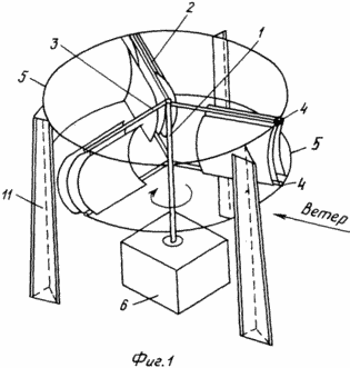 Вдоль оси симметрии горизонтальной платформы 3 установлены вертикальные валы 5, на которых с возможностью поворота размещены радиальные траверсы 6. Балки 7 шарнирно связаны с концами траверс 6 и установлены с возможностью возвратно-поступательного движения параллельно друг другу и флюгеру 8, который также закреплен на платформе 3 в вертикальной плоскости, проходящей через оси поворота траверс 6. На балках 7 закреплены (перпендикулярно направлению движения балок) опорные рамы 9, в которых размещены лопатки 10. Лопатки 10 установлены каждая на отдельной поворотной оси 11 таким образом, чтобы в зависимости от разворота осей 11 образовать либо «сплошной парус», когда аэродинамическое сопротивление максимально, либо решетку из параллельных плоскостей, когда аэродинамическое сопротивление «паруса» минимально. Механизм поворота лопаток 10 (не показан) может быть выполнен в виде цепной передачи с приводом, огибающей зубчатые колеса, закрепленные на осях 11.