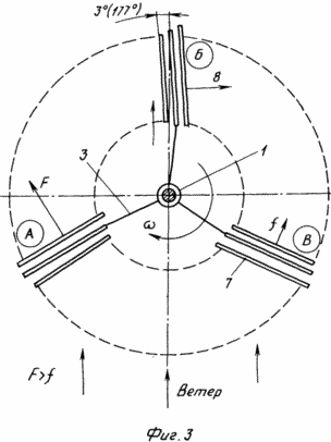 При ветровом потоке чрезмерно большой силы лопатки 10 в рамах 9 устанавливаются под углом к направлению ветра, а не поперек.