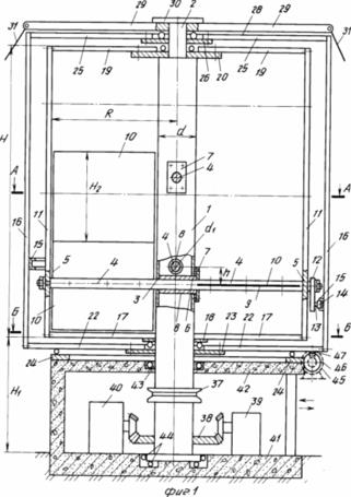 На опорной поверхности размещен кольцеобразный рельс 2, горизонтальная платформа 3 снабжена роликами 4, которыми она оперта на рельс 2.