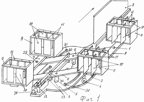 Кроме того, на фиг.1 показаны концевые выключатели 31, шарниры 1, валы 30; на фиг.2 также показаны отверстия 26 инерциального элемента 20, в которые пропущены направляющие 16 поворотной рамы 18.