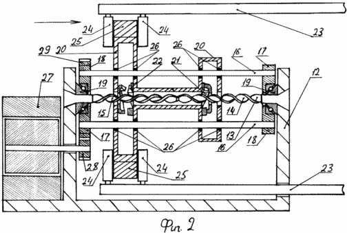 В опорной раме 12, размещенной на горизонтальной платформе 3, неподвижно закреплен вал 13 пластинчатой формы, которому придана винтообразная закрутка, причем вал 13 разделен на два участка 14 и 15, закрутка которых выполнена в противоположные стороны. Горизонтальные направляющие 16, жестко закрепленные в перегородках 17, параллельны друг другу и винтовой поверхности и составляют с последними поворотную раму 18, установленную на подшипниках 19. Инерциальный элемент 20 установлен на горизонтальных направляющих 16 с возможностью вращения и возвратно-поступательного перемещения относительно пластинчатой поверхности вала 13 и снабжен храповыми муфтами с возможностью взаимодействия каждой (на участке 14 - муфта 21, на участке - 15 - муфта 22) только со своим участком вала 14, 15. Консольные балки 23 шарнирно связаны с траверсами 6 с возможностью возвратно-поступательного движения параллельно рабочей плоскости флюгера 8, на концах балок 23 размещены ролики 24, контактирующие с ободом 25 инерциального элемента 20 с возможностью свободного вращения последнего в них. Генератор 27 приводится во вращение зубчатыми колесами 28 и 29.