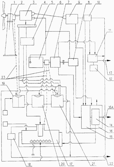 Предложенное техническое решение поясняется чертежом, где изображена схема комбинированной ветроэнергетической установки, содержащей ветроэнергетическую установку 1, ветроколесо выполнено конусным и лопастным с членением на отдельные поворотные лопасти с устройством самоориентации ветроустановки “на ветер” за счет демпфера рыскания, активным элементом которого является кривошипно-шатунный механизм, связанный с пружинным приводом, осуществляющий поворот лопастей (изменение угла их перевоначальной установки), при этом снижается (повышается) крутящий момент и частота вращения (на схеме не показано) с редуктором 2, связанным с нагнетателем воздушного потока (компрессором) 3, оснащенным коллектором высокого давления 4 и блоком низкого давления 5, компрессор 3 питает воздушную силовую турбину 6, состыкованную с основным электрогенератором 7 и газотурбинным двигателем 8, дополнительный двигатель внутреннего сгорания 9 связан с дополнительным электрогенератором 10, основной электрогенератор 7 и дополнительный 10 подключены к энергоблоку 11, который управляется блоком 12 с устройством, оснащенным ЭВМ, обеспечивающим получение электрических параметров, аналогичных электросетевым, от энергоблока 11 электроэнергия по линии 13 направляется в сеть; электрогенератор 7, газотурбинный двигатель 8, дополнительный двигатель 9, дополнительный электрогенератор 10 соединены с блоком утилизации тепла 14, оснащенным газодинамическим 15 и трубчатым 16 теплообменниками, а также электроподогревателем (на схеме не показан), блок утилизации тепла 14 подключен к термодистиллятору 17, подключен также к дополнительному элетрогенератору 10, термодистиллятор имеет сборник чистой воды 18, блок утилизации имеет линию подачи горячей воды потребителю 16А, сборник чистой воды термодистиллятора 18 соединен с обратно-осмотическим устройством, состоящим из заборного блока загрязненной воды 19, блока очистки I-й ступени 20 и блока обратного осмоса 21, и совместно связаны с коммуникацией подачи чистой воды потребителю 22; элементы обратно-осмотического устройства и термодистиллятора 17, 19, 20, 21 для надежного функционирования связаны с редуктором 2 и муфтой между турбиной 6 и основным генератором 7 торсионными валами 23, они (элементы) подключены также к пневмотрассе низкого и высокого давления, а также к электросистеме в одной точке как для технологических целей - приводы насосов, арматуры, элементов управления, так и для управления.