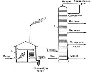 1 – трубчатая печь для нагревания нефти; 2 – ректификационная колонна .