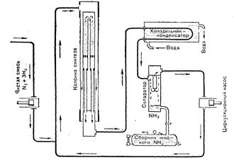 С целью наиболее полного использования исходных материалов » ряде химических производств применяется также принцип циркуляции реагирующих веществ. Как известно, вещества за время прохождения через производственную установку не всегда успевают полностью прореагировать. Не вступившие сначала в реакцию вещества затем снова возвращают в аппарат. Так, например, при синтетическом получении аммиака в контактном аппарате реагирует только часть (30–37 %)смеси азота и водорода; поэтому оставшиеся газы отделяют от образовавшегося жидкого аммиака и с помощью специальных насосов опять направляются в контактный аппарат. Сущность так называемого циркуляционного метода и заключается в отделении ещё не прореагировавших веществ от полученного продукта и возвращении их опять в производство. Циркуляционный метод использования химических веществ – также один из основных принципов современного химического производства.