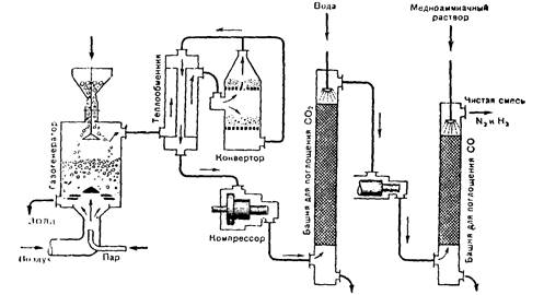 4. Получение исходной азотоводородной смеси: а) газогенератор, б) состав генераторного газа, в) способы удаления ненужных газов (уравнения реакций), г) конвертор, д) теплообменник, е) башни для поглощения углекислого газа и окиси углерода, ж) компрессоры, з) принцип противотока и теплообмена (рис. 9).