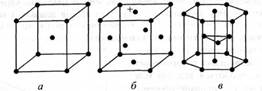 Рис. 1. Основні типи кристалічних ґраток металів (елементарні комірки): а — кубічна об'ємноцентрована; б — кубічна гранецентрована;в — гексагональна