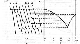 Для того щоб побудувати діаграму стану, досліджують експериментально криві охолодження. Розплавлений чистий метал поступово охолоджують, вимірюючи зміну температури сплаву з часом. На діаграмі температура — час дістають горизонтальну лінію, що відповідає температурі плавлення металу (затримка в охолодженні металу зумовлена виділенням прихованої теплоти кристалізації). Якщо до металу А додати метал В, то в разі поступового охолодження рідкого сплаву кристали металу А осідатимуть за нижчої температури, ніж коли б це був чистий метал. Якщо ж до чистого металу В додати метал А, спостерігатиметься аналогічна картина. Щоб побудувати діаграму стану для двохкомпонентної системи, виготовляють суміші двох чистих металів із різним їх кількісним складом, розплавляють їх і визначають температури початку кристалізації як зупинки на діаграмах температура — час (рис. 2).