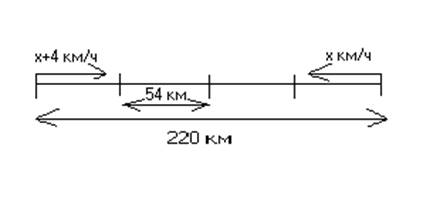 «Скорость велосипедиста на 4 км/ч больше, чем скорость всадника. Через 2 ч расстояние между ними стало равным 54 км. Найти скорости велосипедиста и всадника, если первоначальное расстояние между ними равно 220 км».