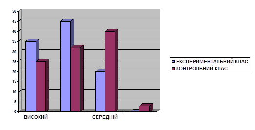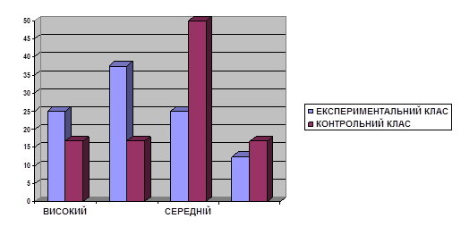 Дані таблиці показують, що в експериментальному класі учнів із високим рівнем навчальних досягнень на 13,5% більше, ніж у контрольному класі, а учнів із достатнім рівнем на 13% більше. В експериментальному класі учнів із середнім рівнем на 17,5% менше, ніж у контрольному класі. В експериментальному класі учнів із початковим рівнем немає, а в контрольному – 9%.