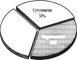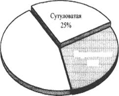 1) Сутулуватість. При цьому дефекті постави є збільшення грудного кіфозу при одночасному згладжуванні поперекового лордозу. Для сутулуватості (на відміну від круглої спини) характерне збільшення кіфотичної дуги у верхніх відділах. Плечі при цьому зведені вперед, лопатки виступають.