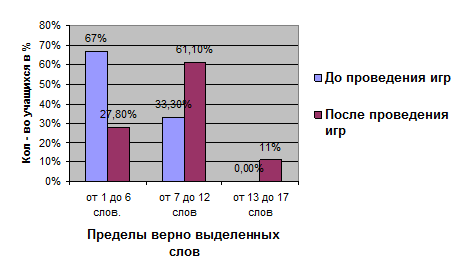 Исходя из полученных данных, после проведения с детьми интеллектуальных игр, мы видим, что результат значительно отличается от первоначального; а именно возросла концентрация внимания, оно стало более устойчивым, об этом свидетельствует увеличение количества верно выделенных слов.