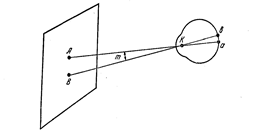 В пространстве находятся две точки А и В. От них на глаз падают лучи, которые после прохождения в преломляющих средах глаза собираются на сетчатке в точках а и б. Лучи после преломления в глазу образуют угол , который называется углом преломления ( угол ВКА равен вертикальному углу АКВ )