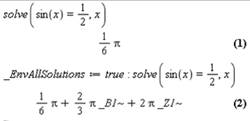 | 3. Введение нового материала(35 мин.) | До тех пор пока не установлено (набрано) _EnvAllSolutions:=true, встроенная функция solve возвращает пользователю только одного представителя корней заданного тригонометрического уравнения. После данной команды она возвращает все множество корней для каждого тригонометрического уравнения