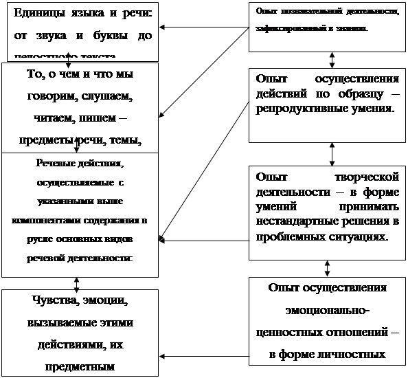 1. Компонентный состав содержания обучения делает акценты в интересах развития свободной активной личности на деятельностную компоненту, на развитие опыта творческой деятельности и ценностные ориентации. На представленной схеме изображено как соотносятся компоненты содержания обучения иностранным языкам с указанной педагогической моделью содержания образования. (схема 1)