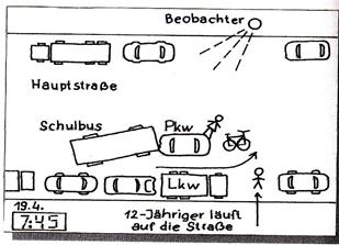 Peter hat den Unfall ganz genau beobachtet und für die Polizei eine Skizze anfertigt.