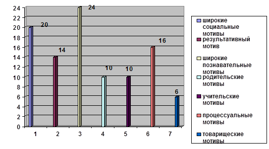Учебно-познавательные мотивы, связанные с содержанием и процессом учения, не занимают ведущего места по числу указаний на них на протяжении всего младшего школьного возраста (21,8%) и не выступают в качестве ведущего реально действующего побудителя учебной деятельности.