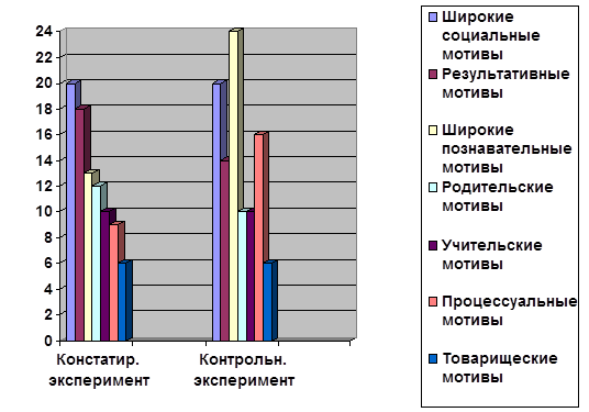| Эксперимент | Широкие соц. мотивы | Результ. мотивы | Широкие познав. мотивы | Родит. мотивы | Учител. мотивы | Процесс. мотивы | Товарищ. мотивы |