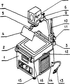 Рис. 1 - Общий вид графопроектора: 1 – корпус; 2 – крышка; 3 – устройство перемоточное; 4 – светофильтр; 5 – штырь; 6 – кронштейн; 7 – объектив; 8 – рукоятка; 9 – винт; 10 – штанга с кронштейном; 11 – рукоятка; 12- кнопка; 13 – кабель; 14 – зажим; 15 – ножка; 16 – устройство перемоточное