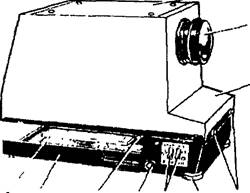 Рис. 2 - Общий вид эпипроектора ЭП: 1 - основание, 2 - корпус, 3 - объектив «Триплет», 4 - крышка, 5 - предметныйстол с микровыключателем, б - ручка подъема предметного стола, 7 -выключатели, 8 - ножки(изменение угла проекции), 9 - винты крепления корпуса коснованию, 10 – лампа подсветки