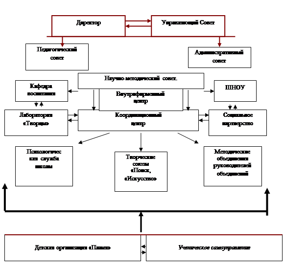 Система управления обеспечивает создание в школе коллектива единомышленников на принципах самоуправления и соуправления, на основе сотрудничества, инициативы и творчества.