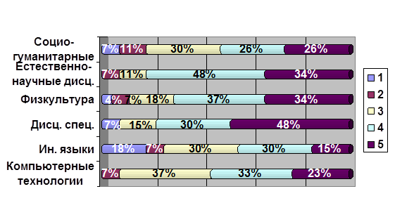 Рис. 6. Удовлетворённость полученными знаниями и навыками по различным предметам