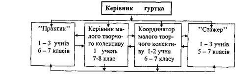 Рис. 1. Структура малого творчого колективу (структура А). У діяльності малого творчого колективу (Рис. 2.) брали участь переважно, учнів (7)8 – 9 класів, з високим (6 – 7) балів рівнем та 1 – 3 «стажерів» з середнім (3 – 5) балів рівнем сформованості інтелектуальних умінь та навичок.