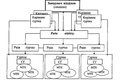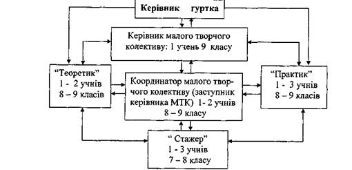 Так, структура МТК чи ДГ (Рис. 1), до складу якої входили учні 5 – 7 класів, порівняно з традиційною забезпечувала набагато вищий рівень організації Індивідуальної і колективної навчально-пізнавальної і дослідницької діяльності та конкретної природоохоронної роботи не лише в умовах позашкільного навчального закладу, а й безпосередньо у природі. Це давало змогу здійснювати ефективну підготовку учнів 5-7 класів до поглибленої навчально-пізнавальної і дослідницької діяльності та конкретної природоохоронної роботи у довкіллі. Такі МТК чи ДГ вирішували не складні за змістом короткотермінові завдання. До їх складу входили учні зі сформованими знаннями, інтелектуальними уміннями та навичками у межах від 1 – 3 до 5 – 6 балів, що дало змогу кожному задовольнити інтереси та розвинути власні задатки.