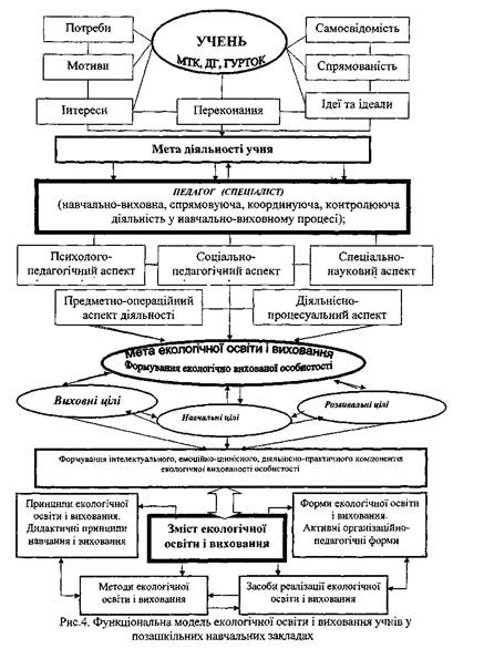 Розглядаючи екологію як полідисциплінарну галузі знань про довкілля і екологічну освіти та виховання, як поліпредметну освітньо-виховну галузь доведено, що зміст останньої може бути ефективно реалізовано відповідними формами, методами та засобами лише у певній педагогічній системі, характерними ознаками якої с: наявність зовнішньої цілісності; складна внутрішня побудова психолого-педагогічних взаємозалежностей у діяльності педагогів і учнів; визначення її як підсистеми широкої та багатоваріантної соціально-педагогічної системи (позашкільний навчальний заклад – загальноосвітня школа-громада). На підставі цього нами обґрунтовано та розроблено функціональну модель (модель ми розглядаємо як педагогічну систему) екологічної освіти і виховання учнів у навчально-виховному процесі позашкільних навчальних закладів еколого-натуралістичного профілю (Рис.4.).