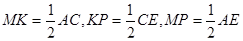 3.08. Точка В не лежит в плоскости ΔAEC , точки М , К и Р – середины отрезков соответственно АВ , ВС и ВЕ (рис.39). а) Докажите, что плоскости МКР и АЕС параллельны. б) Найдите площадь ΔМКР , если площадь ΔAEC равна 48 см2 .