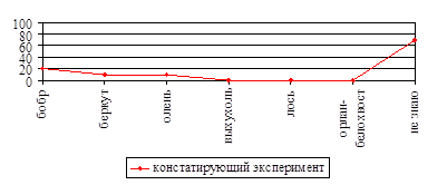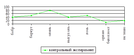 Учащиеся экспериментального класса считают, что в "Красную книгу" нашей страны занесены следующие животные: бобр (40%), беркут (50%), олень (80%), выхухоль (40%), лось (50%), орлан-белохвост (10%). 20% детей не смогли дать ответ. Как видно из графика (рис.15), большинство учащихся назвали охраняемых животных.