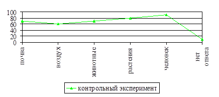 Отвечая на первый вопрос, дети давали следующие ответы: почва (70%), воздух (60%), животные (70%), растения (80%), человек (90%).10% детей не смогли сформулировать свой ответ. Как видно из графика (рис.10), большинство учащихся дали достаточно точные и полные ответы на данный вопрос. Среди компонентов природы школьники наиболее часто называли воздух, растения, воду, животных, человека. На вопрос "Что природа дает человеку?" получены следующие ответы: пищу (60%), лекарства (70%), чистый воздух (50%), одежду (58%), древесину (40%).10% детей не смогли сформулировать свой ответ. Приведенные данные свидетельствуют, что большинство учащихся дали правильные ответы на этот вопрос (рис.11).