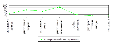 Дети считают, что человек разрушает природу, загрязняя воздух (30%), уничтожая зверей (60%), загрязняя воду (50%), уничтожая насекомых (85%), губя растения (20%), разоряя птичьи гнёзда (10%).10% детей не дали ответа. Приведенные данные (рис.13) свидетельствуют, что школьники узнали о влиянии человека на природу.