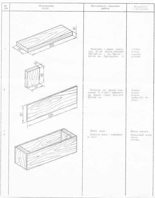 Отже, при вивченні цієї теми основним завданням є узагальнення знань учнів і закріплення набутих ними вмінь та навичок. Оскільки в процесі вивчення навчальної теми треба залучати учнів до продуктивної праці, можливості виконання зазначеного завдання залежать значною мірою від того, наскільки вдало вибрано об'єкти роботи. У наведеному прикладі таким об'єктом є виготовлення шкатулки. У процесі її виготовлення учні повторюють основні трудові операції, застосовують елементи дизайну тощо.