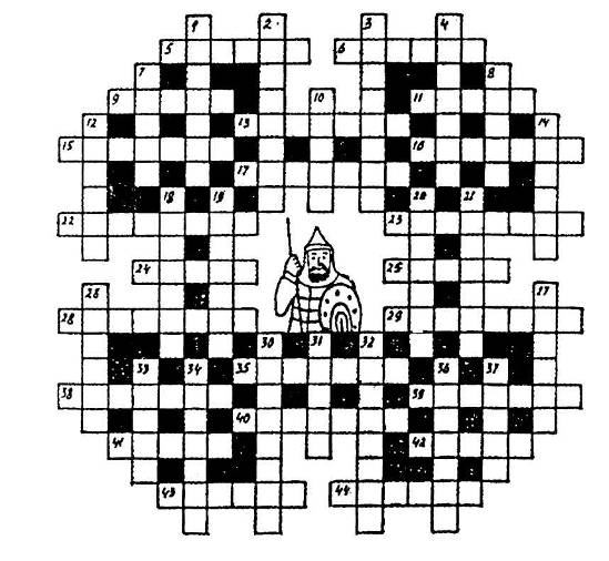 По вертикалі: 1. Український письменник, автор історичних творів про героїчне минуле українського народу. 2.Український історик і етнограф, автор праць з історії дворянства і народного побуту. 3. Автор трилогії "Зоряна фортеця" 4. Польський король, котрий придушив на Україні повстання Мухи. 7. Бій, під час якого козацьке військо змішувалося з ворожим. 8. Український церковний діяч, київський митрополит. 10. Український письменник і культурно-освітній діяч середньовіччя. 12.Український живописець, який брав участь у розписах Софії Київської. 14. Велике трищоглове судно XVI - XVII ст., озброєне важкою артилерією. 18. Козацька рада на річці... (1687). 19. Персонаж опери К. Данькевича "Богдан Хмельницький". 20. Український архітектор, який у 1597 р. разом з П. Римлянином збудував у Львові Успенську церкву. 21 Права притока Пруту. 26 Французький військовий інженер XVII ст., автор "Опису України". 27. Археолог, один із засновників Київського музею старожитностей і мистецтв. 30. Показник днів року. 31.Головний бог Придніпров'я, коли Телець був сузір'ям весняного рівнодення. 32.Учень вищого класу "Києво-Могилянської духовної академії. 33. Чорногуз. 34 Російський вчений, дослідник історії Київської Русі. 36. Українська народна назва Чумацького шляху. 37.Шапка козака Голоти.