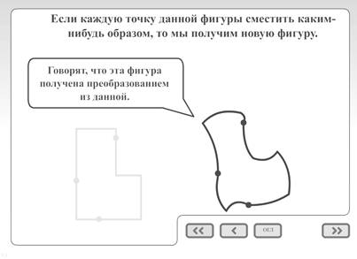 Третья сцена посвящена процессу преобразования фигуры. Здесь наглядно представлено преобразование одной фигуры в другую и ученикам становится более понятно, как происходит этот процесс. В конце формулируется определение, что называется преобразованием фигуры.