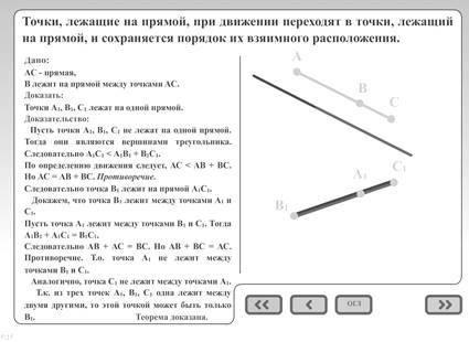 Начиная с пятой сцены идет более строгое изложение материала. В данной сцене материал посвящен основному свойству движения (точки, лежащие на прямой, при движении переходят в точки, лежащие на прямой, и сохраняется порядок их взаимного расположения). Сцена позволяет ученикам наглядно рассмотреть при доказательстве различные случаи, например, когда точки не лежат, на одной прямой (показывается треугольник и иллюстративно поясняется противоречие в доказательстве) или когда стоятся неверные предположения о взаимном расположении точек (идет наглядная иллюстрация неравных отрезков).
