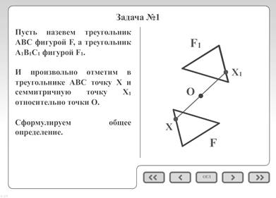 После идет логический переход к формулировке общего определения преобразования симметрии, на основе предыдущего построения (в учебнике данному факту не уделяется должного внимания, что приводит к некоторым затруднениям в понимании материала у отстающих учеников. Кадр 8:19).