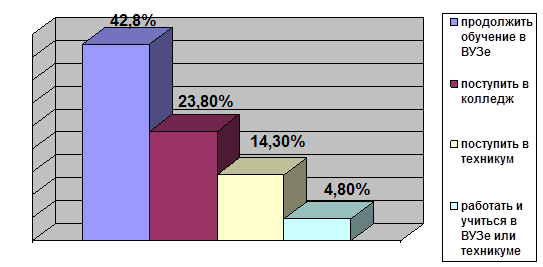 В ходе исследования было установлено, что жизненные планы учащихся сформированы достаточно хорошо. Об этом свидетельствует то, что с родом занятия после обучения в школе определились 85,7% всех учеников. Из них продолжить обучение в ВУЗе хотят 42,8% опрошенных, поступить в колледж 23,8%, поступить в техникум 14,3%, работать и учиться в вузе или техникуме 4,8%. Примечательно, что вариант устроиться на работу без продолжения обучения не выбрал никто.