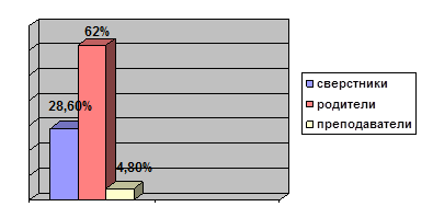 Закономерно также и то, что в наибольшей степени на выбор профессии школьников повлияли родители, так ответили 43%, и в меньшей степени преподаватели – 9,5%.