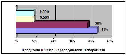 Закономерно также и то, что в наибольшей степени на выбор профессии школьников повлияли родители, так ответили 43%, на 38% опрошенных никто не повлиял, и в меньшей степени на профессиональный выбор учеников повлияли учителя 9,5% и сверстники 9,5%