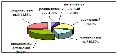 Никакой исследовательской работы по выявлению профессиональных предпочтений у учащихся не ведется. А вот, определение профессионально ориентированных типов личности показало, что в классе 28,57% детей с художественным типом и 26,20% с предпринимательским типом; но не для одних, не для других не предусмотрено ни каких вариантов дальнейшего обучения в соответствии с их способностями. Созданные в школе профили: физико-математический и химико-биологический на реалистический и интеллектуальный типы, которых в классе оказалось абсолютное меньшинство, по 4, 72% и 2,38% соответственно.