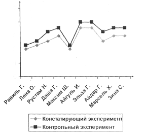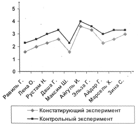 На основе сравнения данных констатирующего и контрольного эксперимента можно наглядно представить, на сколько повысился уровень речевого развития каждого ребенка (см. таблицу 1).
