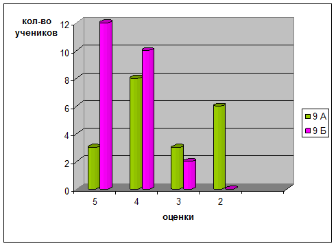 После проведения разработанных занятий были проведены контрольные работы и тесты, которые приведены в последнем разделе. Результаты эксперимента в школе приведены в диаграммах, отражающих изменения качества знаний и успеваемости в контрольном (9а) и экспериментальном (9 (б)) классах.