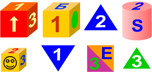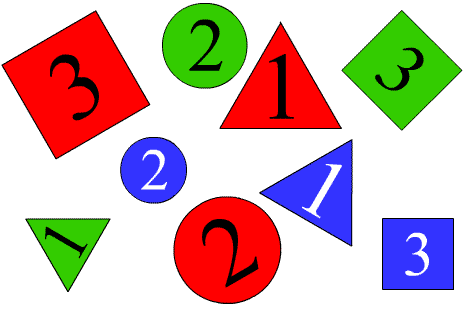 Примечание: единица написана на треугольниках (3 штуки), двойка на кружках (3 штуки), тройка на квадратах (3 штуки). Фигуры могут быть трех разных цветов (например, синего, зеленого и красного) и трех размеров (большой, средний, маленький).