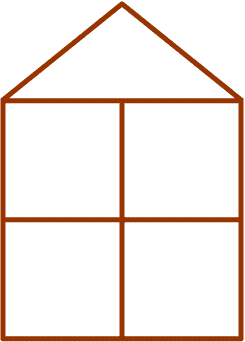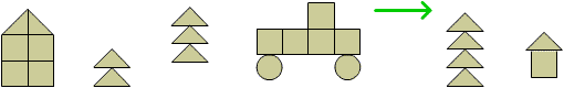 Для складывания дома используются квадратики из набора, для крыши надо приготовить несколько картонных фигур разного размера и формы, чтобы ребенок мог выбрать нужную и по форме, и по размеру (цвет одинаковый).