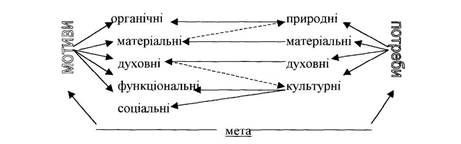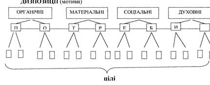 Виходячи з цього, Р.С.Немов представив схематично співвідношення між диспозиціями (мотиви), потребами і цілями, як загальну структуру мотиваційної сфери [67;с.394].