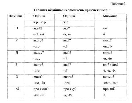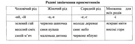 Розгляньте таблицю. Що можна сказати про закінчення прикметників в однині? (вони змінюються: чоловічий рід- -ий, -ій; жіночий рід - -а, -я; середній рід - -е, -є). Зверніть увагу на закінчення прикметників у множині (вони не змінюються мають однакове закінчення -і ). Зробіть висновок про змінювання прикметників за родами. Порівняйте свої висновки з правилом. Назвіть основу прикметників. Які закінчення мають прикметники з основою на твердий приголосний? (-ий, -а, -е). А з основою на м'який приголосний? (-ій, -я, -є).